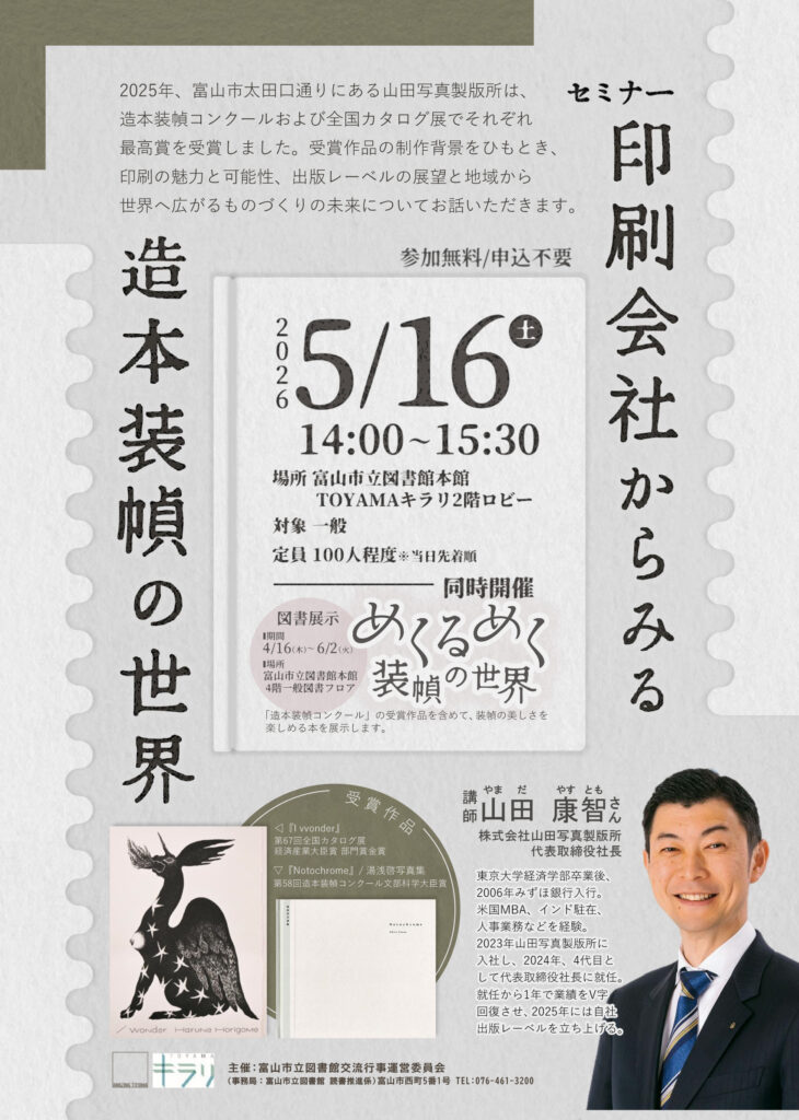 また、5月16日(土)には、弊社代表取締役社長の山田康智によるセミナー「印刷会社からみる造本装幀の世界」を開催いたします。